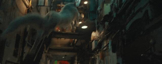 镜头跟随巨型生物,在霓虹灯下穿梭,